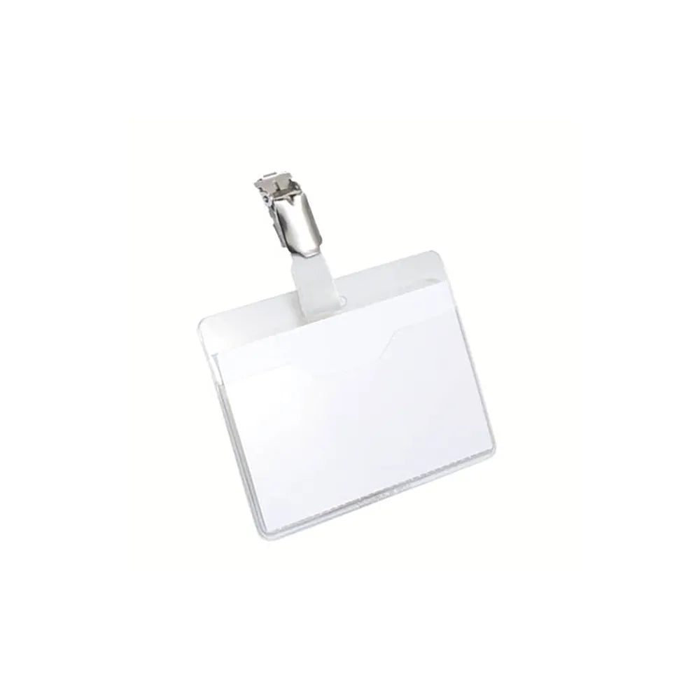 Durable transparent hard PVC visitor badge in landscape format. The badge has a drop level front which allows for easy removal and replacement of inserts. Includes a rotating metal clip for vertical support and blank insert cards measuring 60x90mm.