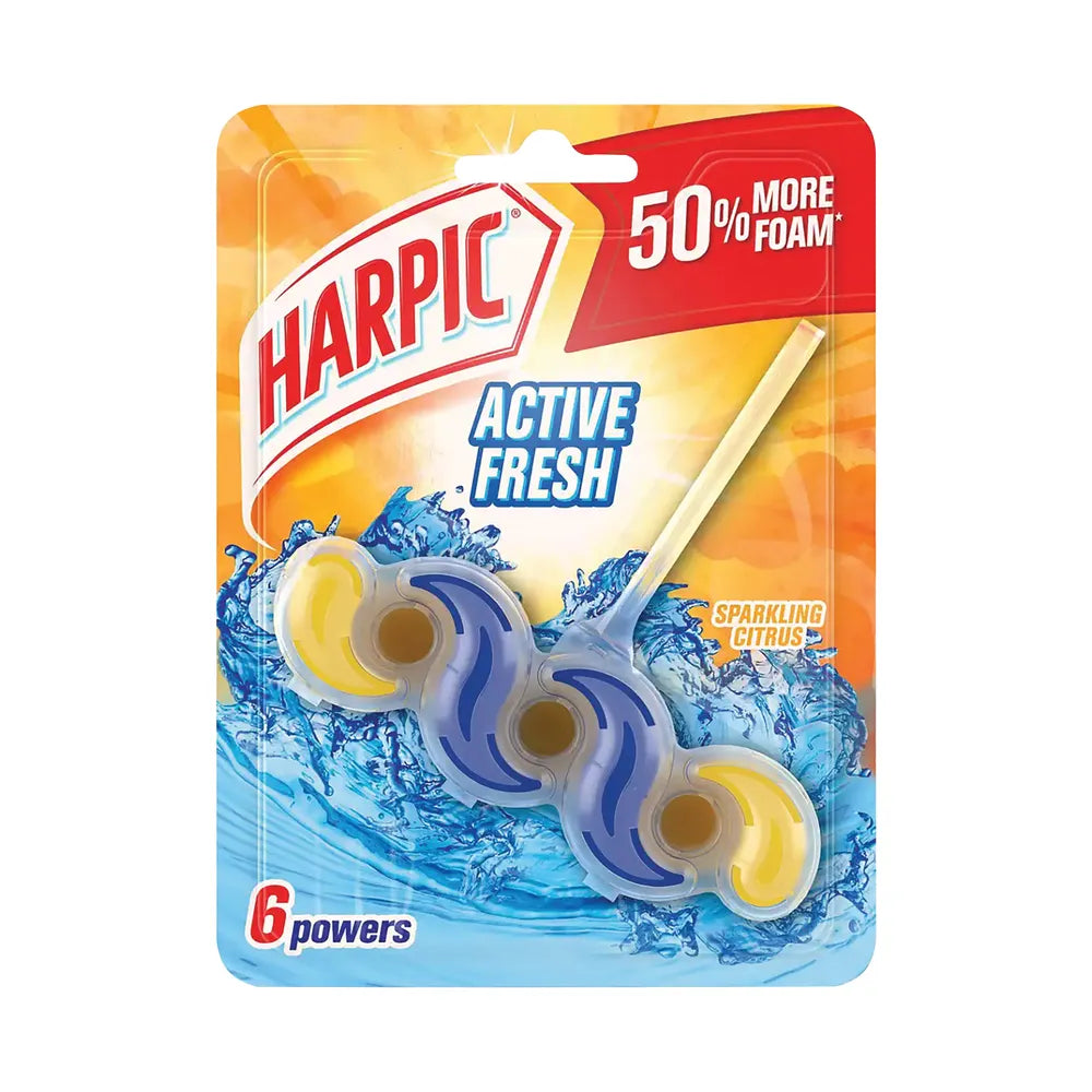 Harpic Active Fresh toilet rim block 6 Powers freshen toilet bowls for up to 4 weeks. With 6 powerful actions to keep toilet bowls looking and smelling fresh in a Sparkling Citrus scent. For shine, dirt removal, anti-limescale and more.