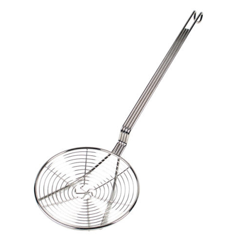 178mm nickel-plated spiral wire skimmer for frying, boiling, and blanching. Durable, lightweight, and perfect for home or professional kitchens.
