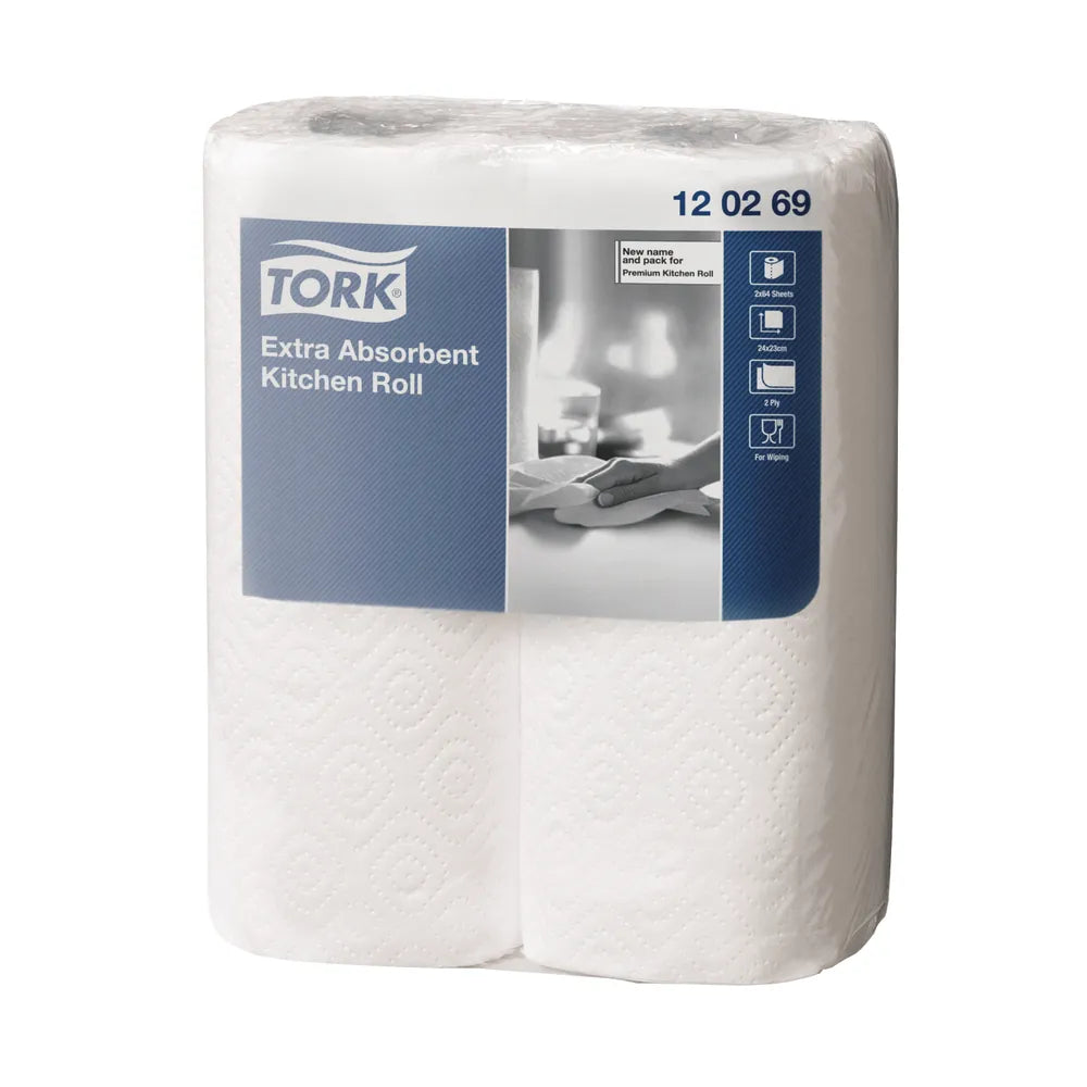 Suitable for wiping and drying kitchen surfaces and equipment, this Tork kitchen roll is soft, strong and absorbent for efficient use with less waste. The 2 ply white paper can absorb water, oil and food remains for cleaner working surfaces. Each roll is 15.4m long and contains 64 embossed sheets. Ideal for cleaners, caterers and shared kitchens, this bulk pack contains 24 rolls (12 packs of 2 rolls).