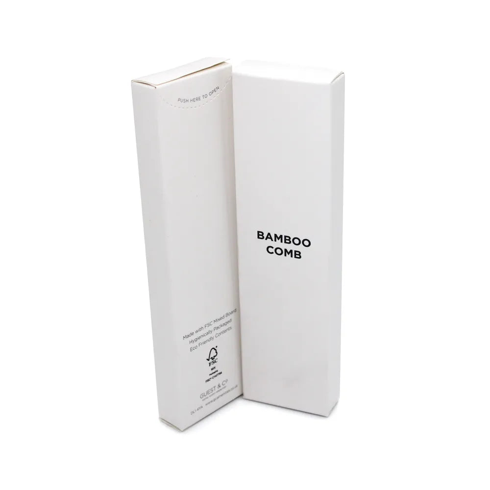 This range of guest accessories for bathroom and bedroom is hygienically packaged in matt white, perforated boxes using either zero or minimum plastic. Cornstarch and paper are used to replace plastic to give an environmentally friendly range of guest accessories. This pack contains a bamboo comb with 45 teeth, measuring 135 x 30mm. Supplied in a pack of 250 boxes.