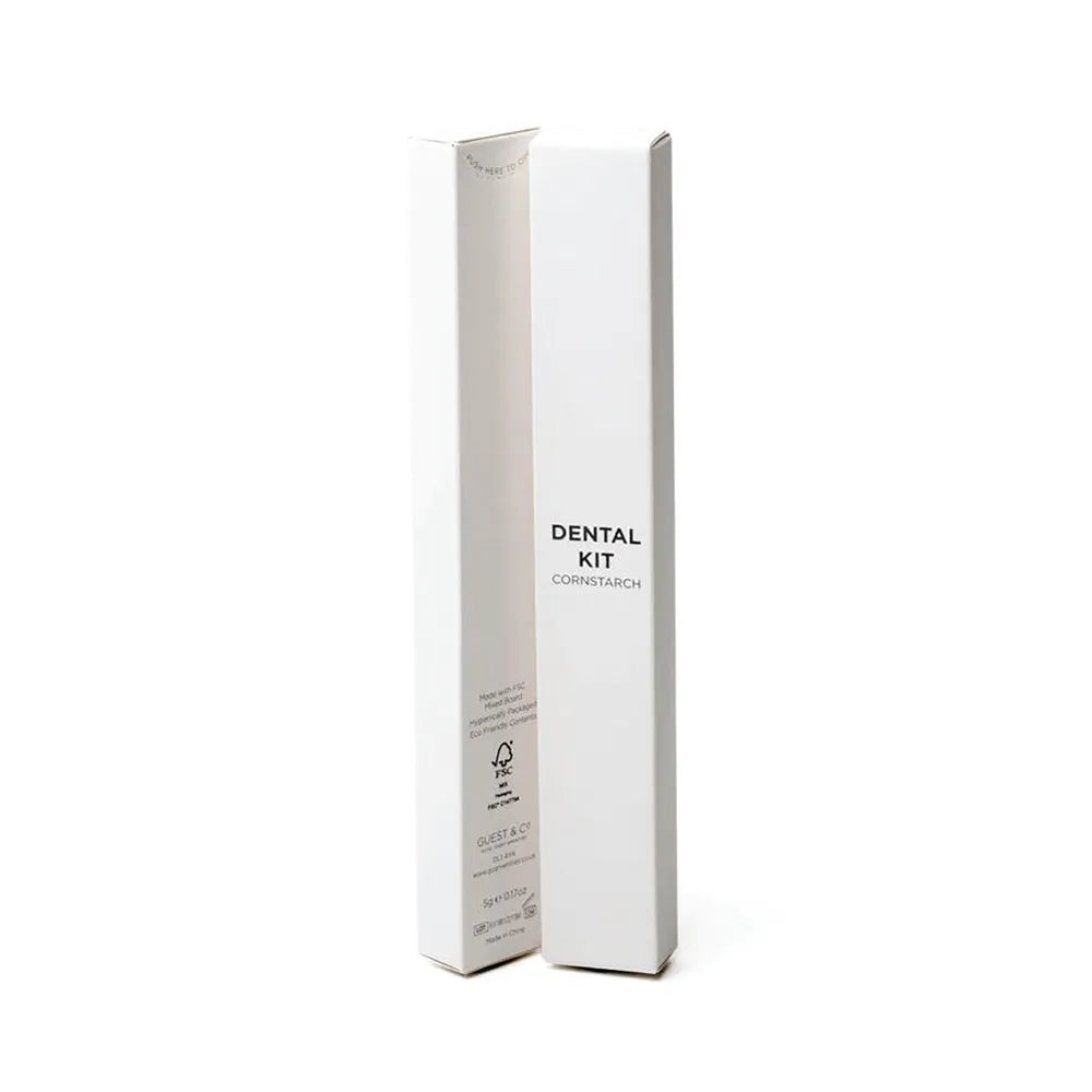 This range of guest accessories for bathroom and bedroom is hygienically packaged in matt white, perforated boxes using either zero or minimum plastic. Cornstarch and paper are used to replace plastic to give an environmentally friendly range of guest accessories. This pack contains a cornstarch toothbrush with white bristles and a 5g tube of Colgate toothpaste. Supplied in a pack of 250 boxes.